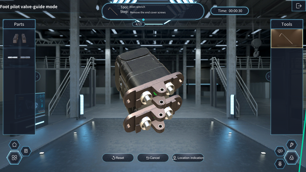 Mô-đun cấu trúc nguyên lý cho phép kéo, xoay, phóng to và thu nhỏ mô hình 3D tự do. Học viên có thể tạm dừng, tua lại hoặc bật chế độ mô hình bóc tách (explosion view) để phân tích chi tiết và quan sát hoạt động của từng bộ phận thủy lực.